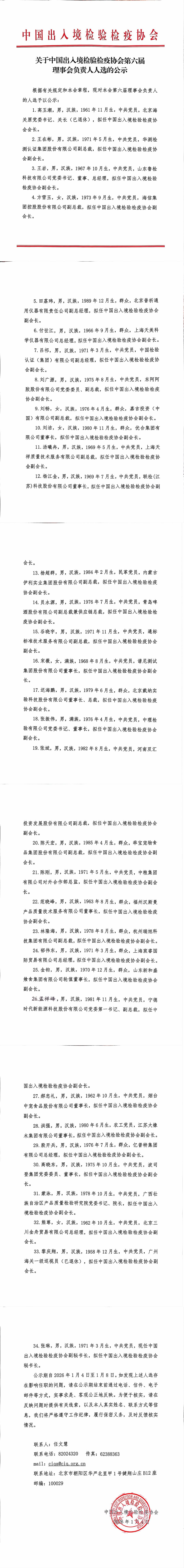 您现在的位置是:首页 > 工作动态与通知公告 关于中国出入境检验检疫协会第六届理事会负责人人选的公示 发布日期:2026-01-04 字体: 【小】 【中】 【大】 分享: 热门文章: 接棒启新航 聚力向未来 | 中国出入境检验检疫协会第六届第一次会员代表大会[2026-01-28] 检测和校准实验室认可技术培训班在西安成功举办[2025-12-16] 重磅!中国出入境检验检疫协会国际贸易便利化分会正式成立[2025-11-22] 第七届国际检博会圆满举办:链动全产业链,共启检验检测新生态[2025-11-17] 中国出入境检验检疫协会参加第八届中国国际进口博览会及相关活动[2025-11-11] 海关资讯 2025年港珠澳大桥口岸进出口货值超3000亿元 去年全国海关查获外来物种5439批次——防范口岸入侵风险取得突出成效 覆盖全球约1/3经济总量,RCEP正式生效四年了——“家门口”的外贸生意越来越旺 粤港澳大湾区内地九市外贸规模创历史新高 海关总署公告2026年第12号(关于启动进出口货物多式联运(海铁、水水部分)业务模式试点相关事项的公告) 海关总署 农业农村部公告2026年第11号(关于解除巴西南里奥格郎德州新城疫疫情禁令的公告) “十五五”时期海关将适度扩大进口 海南自贸港封关运作“满月”
