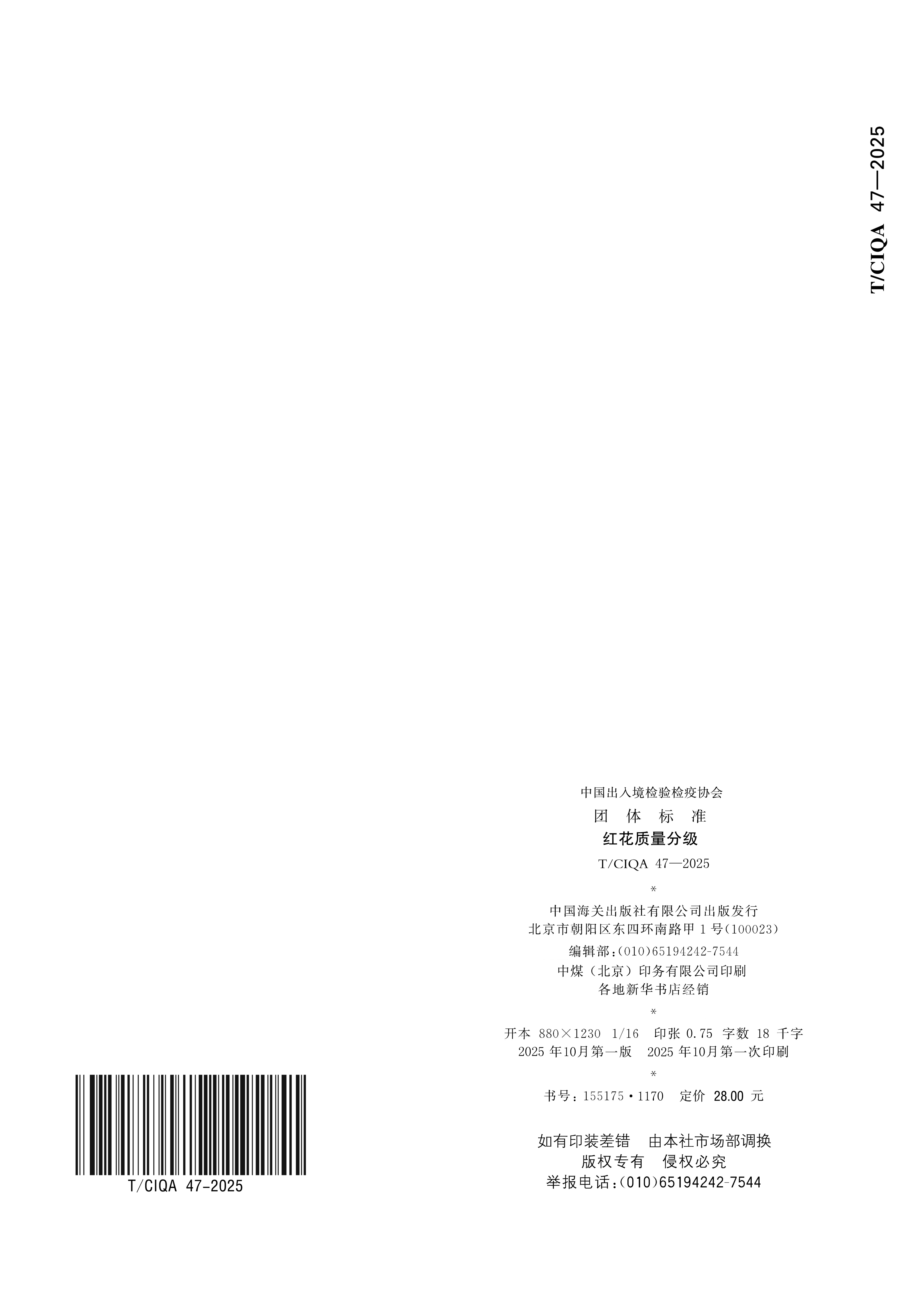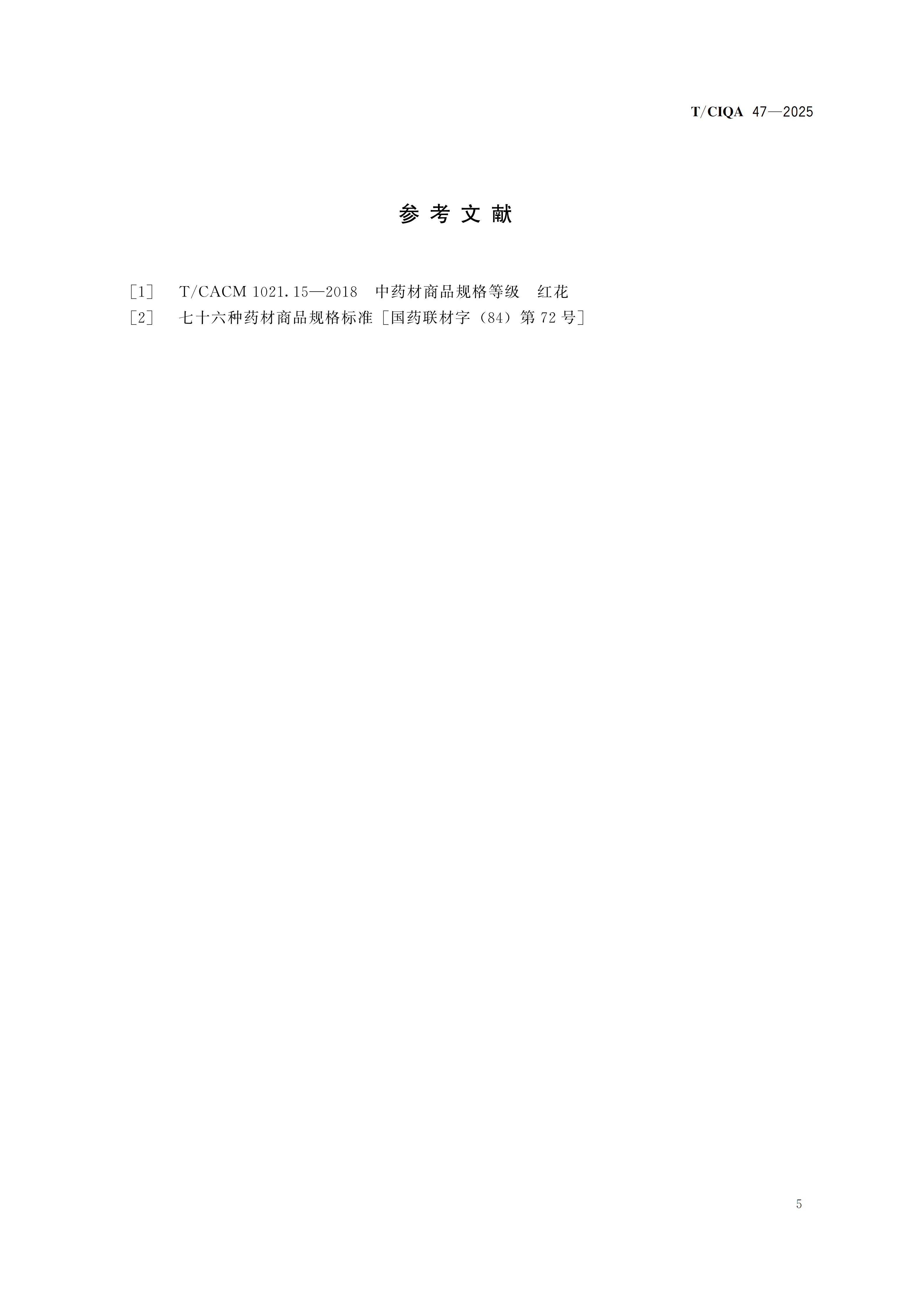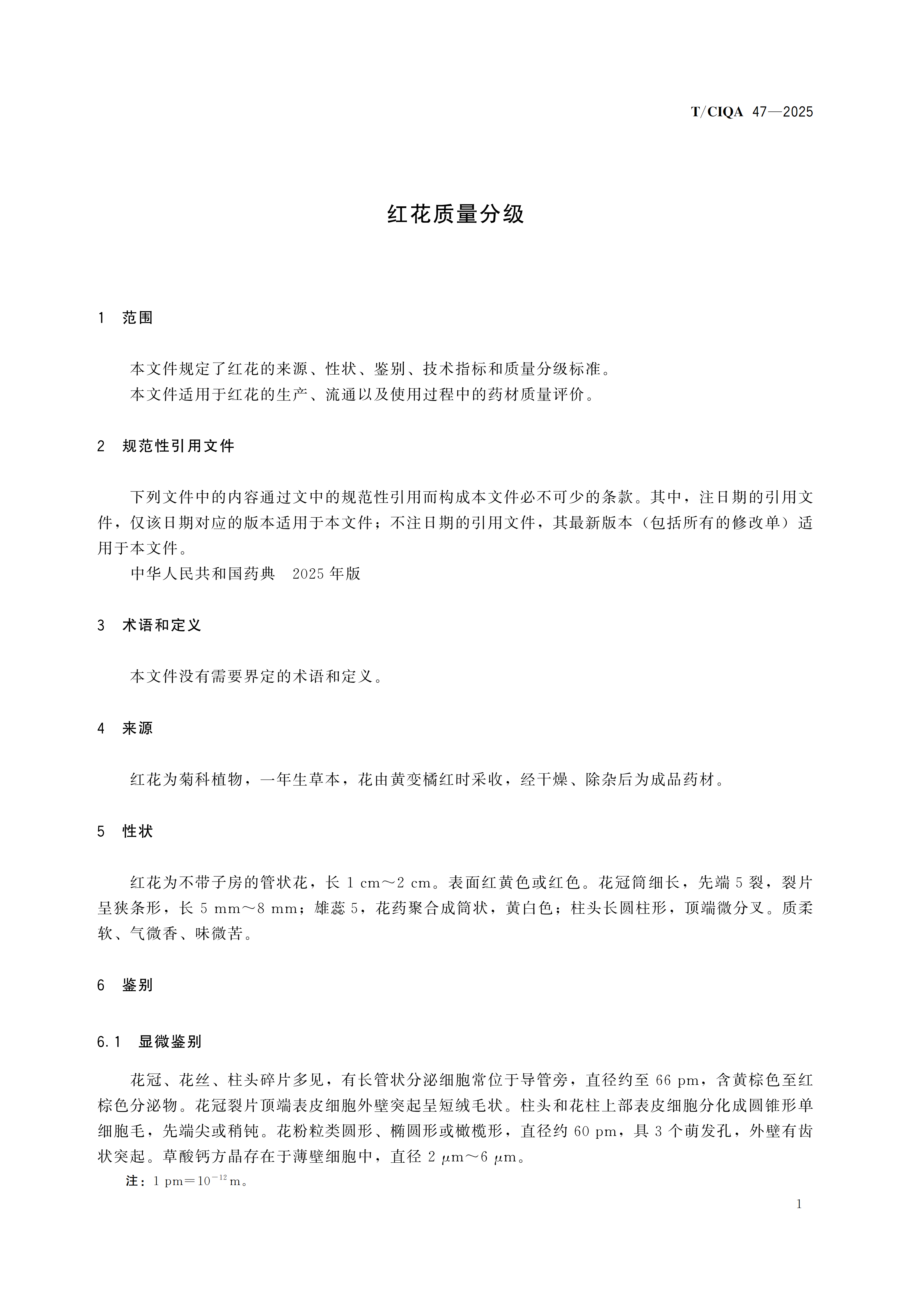 您现在的位置是:首页 > 团体标准文件 TCIQA 47-2022《红花质量分级》 发布日期:2025-12-29 字体: 【小】 【中】 【大】 分享: 热门文章: 接棒启新航 聚力向未来 | 中国出入境检验检疫协会第六届第一次会员代表大会[2026-01-28] 检测和校准实验室认可技术培训班在西安成功举办[2025-12-16] 重磅!中国出入境检验检疫协会国际贸易便利化分会正式成立[2025-11-22] 第七届国际检博会圆满举办:链动全产业链,共启检验检测新生态[2025-11-17] 中国出入境检验检疫协会参加第八届中国国际进口博览会及相关活动[2025-11-11] 海关资讯 2025年港珠澳大桥口岸进出口货值超3000亿元 去年全国海关查获外来物种5439批次——防范口岸入侵风险取得突出成效 覆盖全球约1/3经济总量,RCEP正式生效四年了——“家门口”的外贸生意越来越旺 粤港澳大湾区内地九市外贸规模创历史新高 海关总署公告2026年第12号(关于启动进出口货物多式联运(海铁、水水部分)业务模式试点相关事项的公告) 海关总署 农业农村部公告2026年第11号(关于解除巴西南里奥格郎德州新城疫疫情禁令的公告) “十五五”时期海关将适度扩大进口 海南自贸港封关运作“满月”